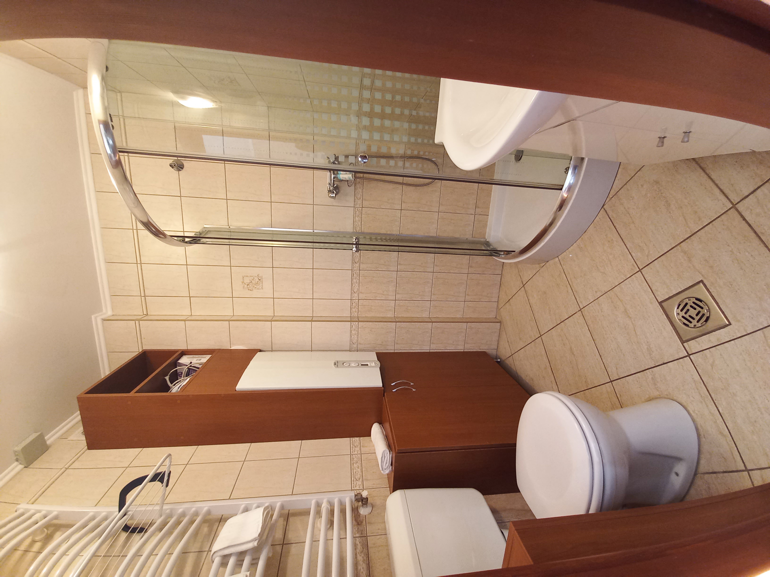 Fürdőszoba (zuhanykabin, wc, törölköző, hajszárító)